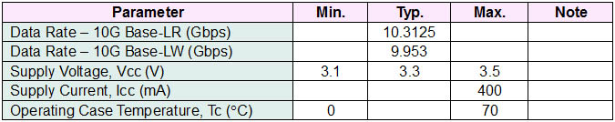 This optical transceiver is designed for 10Gb/s serial optical interfaces for data communications through 9/125 micron single mode fiber (SMF). It supports 1.25Gb/s to 11.1Gb/s up to 10km distance.